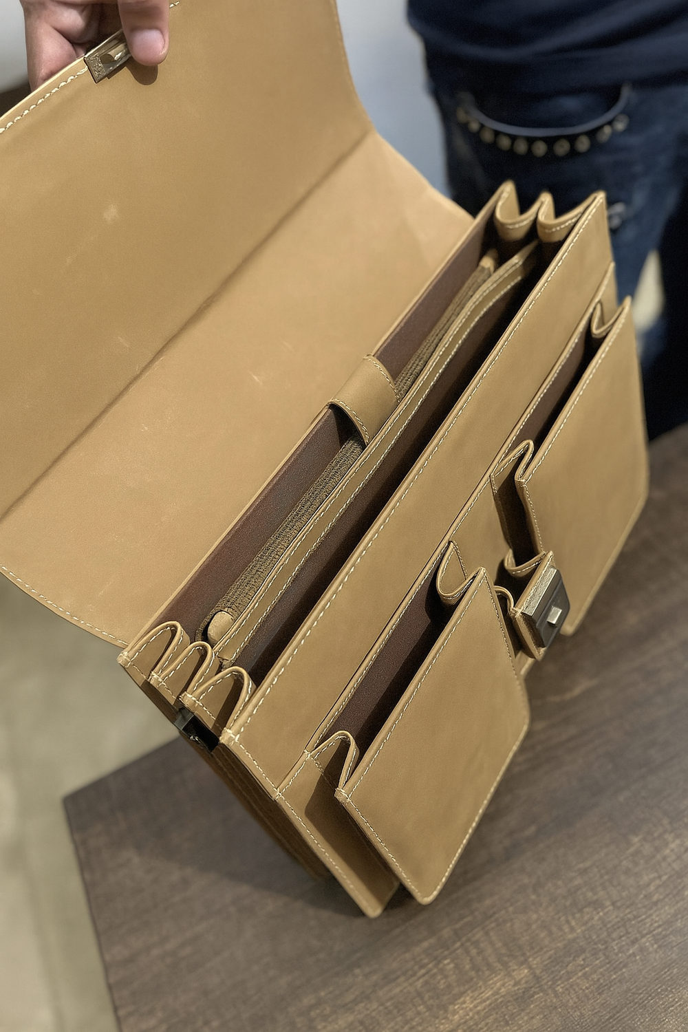 Wipe with a soft dry cloth, keep it away from prolonged moisture/heat, and condition every 3–6 months with a leather conditioner. If it gets wet, blot gently and let it air-dry—don’t use direct heat.